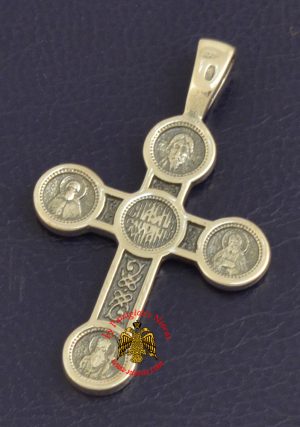A sophisticated double sided Silver cross pendant decorated with Orthodox Russian Designs and Patterns, handcrafted with the finest attention to the detail, with the Holy Icons of Christ, Theotokos, Saint John, Saint Luke, Saint Seraphim of Sarof, Saint Sergios and Agio Mandilio.