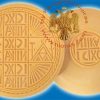 Blue Round Glass with Theotokos Metal Figure, hanging from a cord.