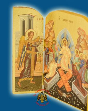 Ξύλινο Εικόνισμα Τρίπτυχο με την Ανάσταση.Στο πίσω του ξύλου υπαρχεί σχεδιασμένο ενας σταυρός.