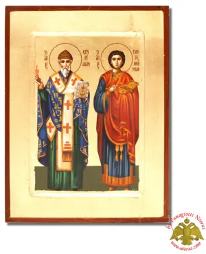 Hand Made The Saints Spyridon and Panteleimon Byzantine Wooden Icon on Canvas. Offered into a variation of styles on Flat and Framed Wood Made in Greece from our WorkShop