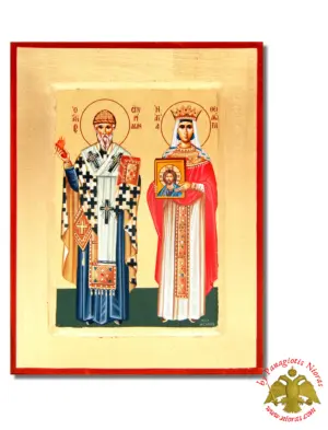 Hand Made The Saints Spyridon and Theodora Byzantine Wooden Icon on Canvas. Offered into a variation of styles on Flat and Framed Wood Made in Greece from our WorkShop