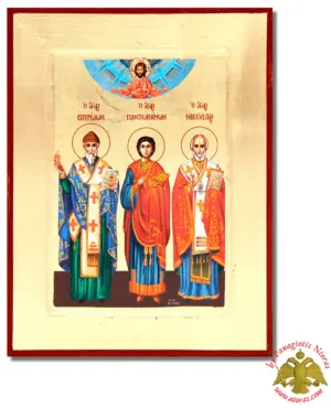 Hand Made The Saints Spyridon, Panteleimon and Nicholas Byzantine Wooden Icon on Canvas. Offered into a variation of styles on Flat and Framed Wood Made in Greece from our WorkShop