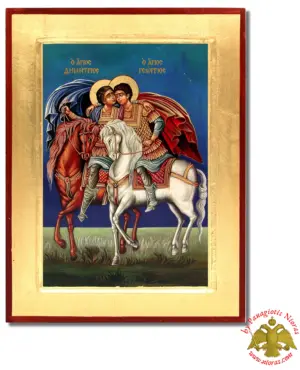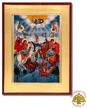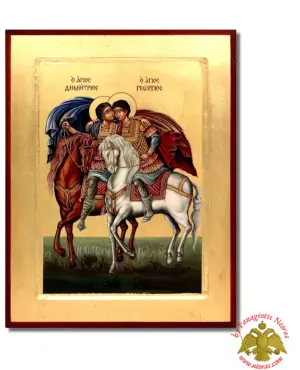 Hand Made The Saints George and Demetrius Byzantine Wooden Icon on Canvas. Offered into a variation of styles on Flat and Framed Wood Made in Greece from our WorkShop